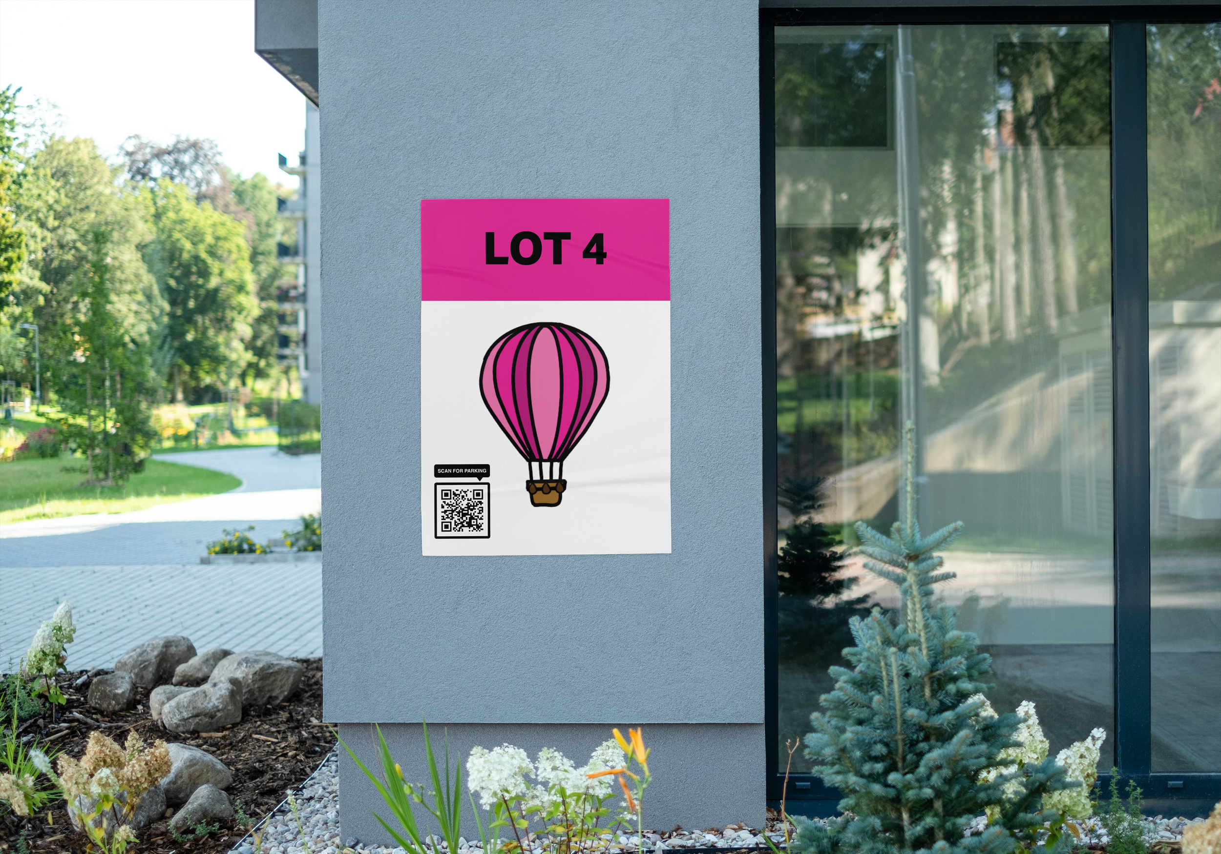 A series of signs to differentiate the different parking lots or parking garage levels at a mall. A number, color, and image are assigned to each lot, and in the mall, before you exit, it will tell you what lot you were headed to.